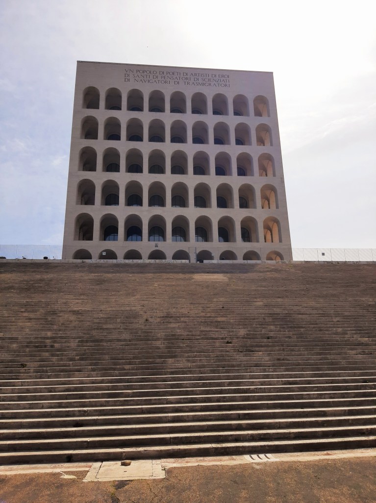 The Palace of Civilisation itself I found horrifying and fascinating in equal measure. It was so unbelievably stark, placed atop a hill overlooking the entire district. The white marble juxtaposes sharply with the green treelined avenues and parks dotted around EUR, which despite the austere rationalist architecture, leaves a weirdly pleasant feeling of coolness and airiness in a city that gets extraordinarily hot and humid in summer.