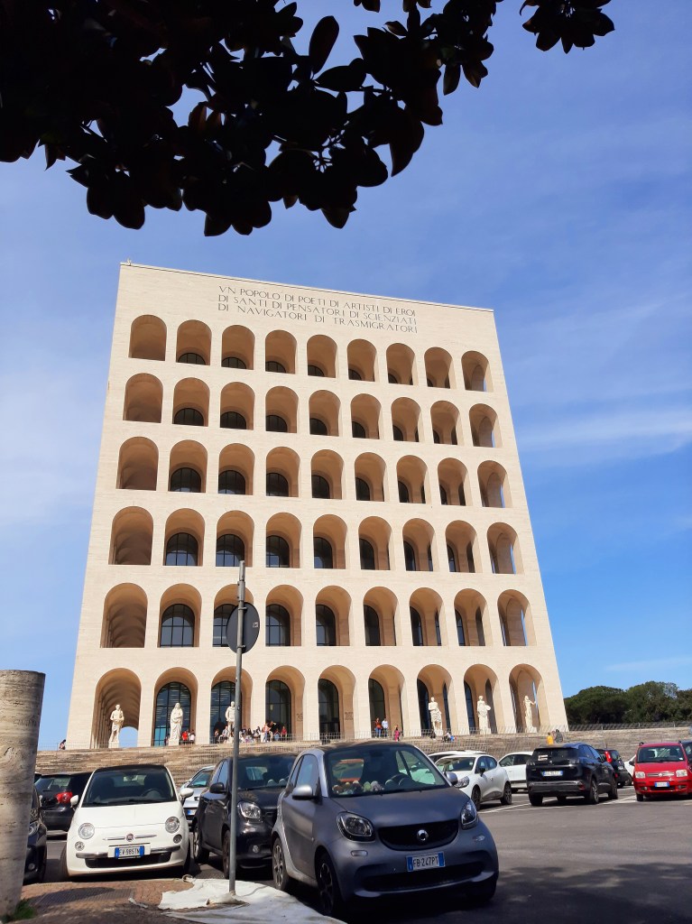 The Palace of Italian Civilisation (pictured above), or Squared Colosseum (or as L called it, the Fascist Colosseum) is the marble centrepiece of the district and looks like a mash-up of Roman temples and various administrative buildings from the Roman age. Designed by three architects of the fascist era, Giovanni Guerrini, Ernesto La Padula, and Mario Romano, it was supposed to represent Italian history from Roman times and, in true fascist style, connecting this with the superiority of the Italian race. L explained that the inscription at the top was taken from a speech by Mussolini, and referred to Italy as a nation of thinkers, poets, artists, scientists, heroes, and so on. The sculptures on podiums around the structure itself represent these qualities, cared from Carrara marble.