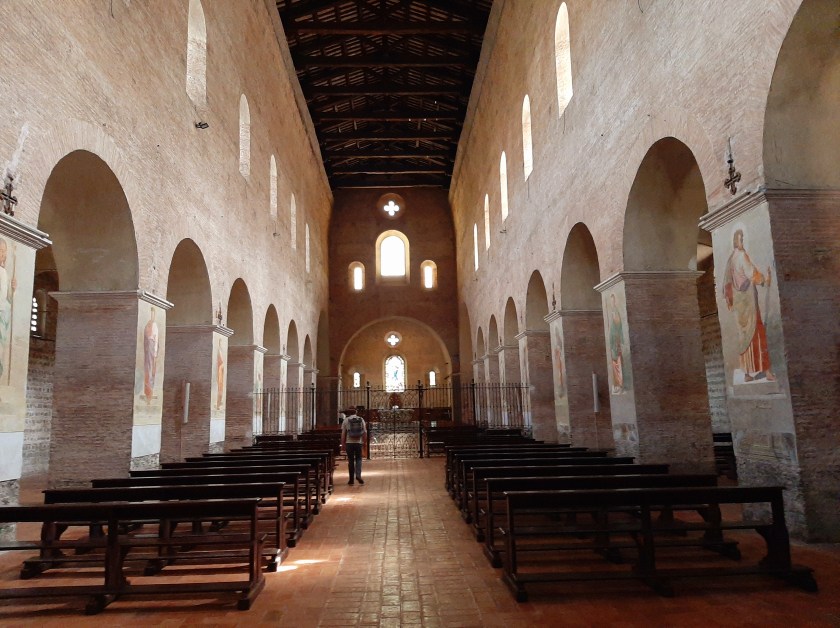 We got off the metro at EUR Fermi, the third of the three EUR metro stops (EUR Palasport and EUR Magliana the other two). It was a fairly long walk around administrative buildings, post office and bank headquarters that seem to characterise EUR Fermi, around a somewhat creepy near-deserted funfair, uphill through a surprisingly luscious and verdant park (given it was wedged between dual carriageways) and then back down toward the road. We crossed the busy dual carriageway, and then noticed a brown sign directing us to Tre Fontane behind a high wall. The moment we entered the gates, we found a long, tree-lined avenue leading to the abbey. Although the dual carriageway was right alongside us, the high stone wall and the trees prove surprisingly effective at blocking out traffic noise and it felt strangely still and quiet.